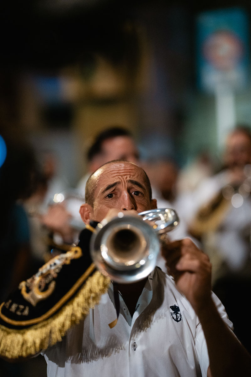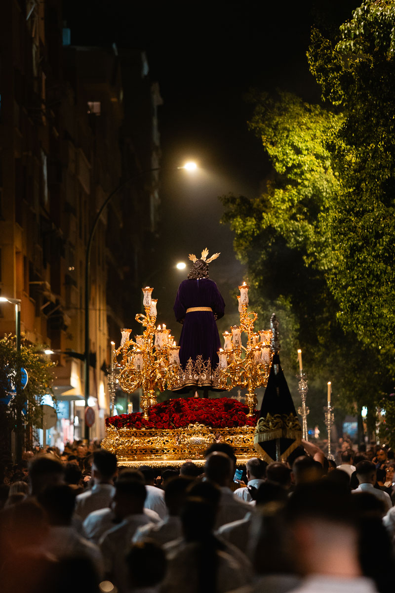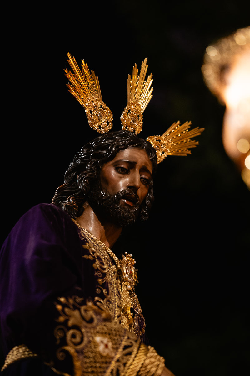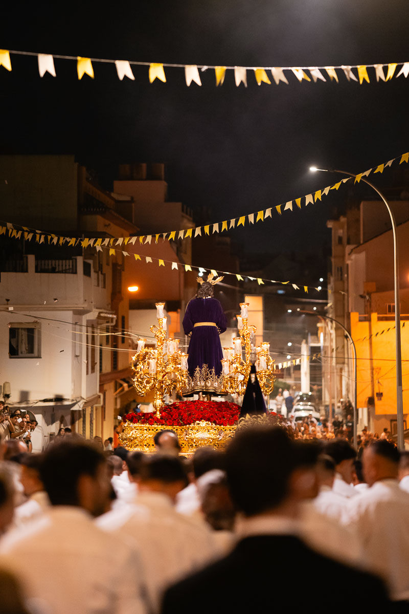 Entre los muchos instantes vividos, hay tres que permanecerán imborrables. El primero, la subida al Cementerio de San Miguel al son de Nazareno del Paso: la tenue luz, el silencio respetuoso y el marco del lugar convirtieron aquel momento en un homenaje íntimo a quienes ya descansan allí. Más adelante, el paso por Calle Tizo con la marcha El Día del Señor marcó uno de los puntos culminantes del recorrido. La cercanía del público y la estrechez de la calle hicieron que cada nota resonara con fuerza, llegando de lleno a quienes aguardaban la dulce mirada del Señor. Finalmente, el encuentro con la Virgen del Dulce Nombre, en la Pastora, cerró la jornada con un instante pleno de significado, con la Hermandad reunida ante las dos imágenes que dan sentido a su historia.