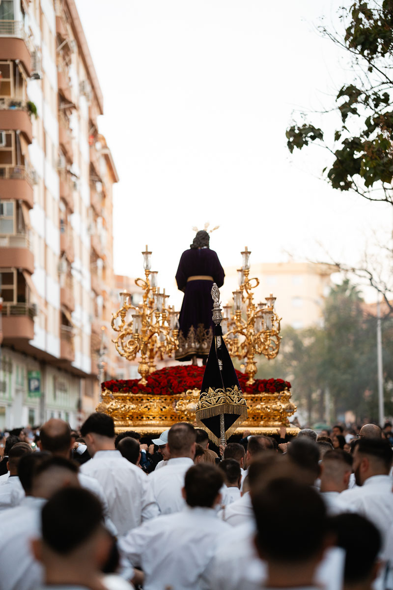 El pasado 4 de octubre de 2025 quedará grabado para siempre en la historia de nuestra formación. Por primera vez, tuvimos el privilegio de acompañar a Nuestro Padre Jesús de la Soledad, titular de la Hermandad del Dulce Nombre, en su salida extraordinaria con motivo del XXV aniversario de su bendición. Una cita muy esperada por la Málaga cofrade, que anhelaba ver al Señor recorrer las calles del barrio de Capuchinos.